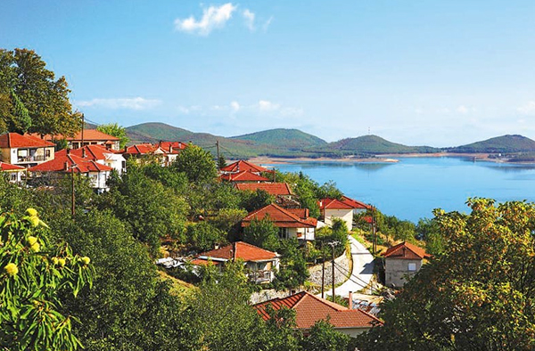 | Our route around the lake continues to the villages of Belokomitis, Karitsa, Karvasaras, the Tavropos Dam and the east side. Its beauty is difficult to described and impresses all year round. We go over the lake's fiords, next to towering firs and chestnut trees. We see Mountain Olympus, the whole east side of the plateau, Mouha, Belokomitis, vast forest with the high firs, the Alonaki Estate and the clear blue waters of the lake.